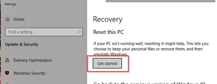 2. In the Recovery menu under Reset this PC Click the Get started button.