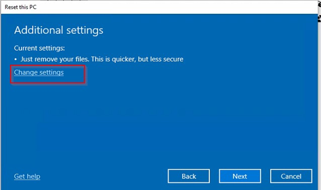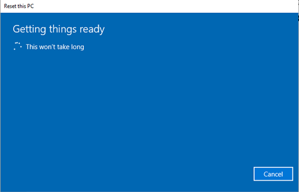 9. The system will reset it will take 30 min or longer to complete. Once complete you the system will be like it was fresh out of the box. Meaning that you will have to go through the Out of Box experience.