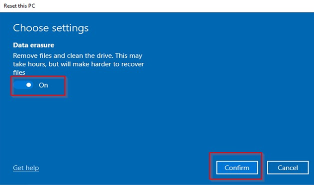 5. On the Choose settings screen toggle on the Data erasure option. This is the complete wipe option. Click Confirm.